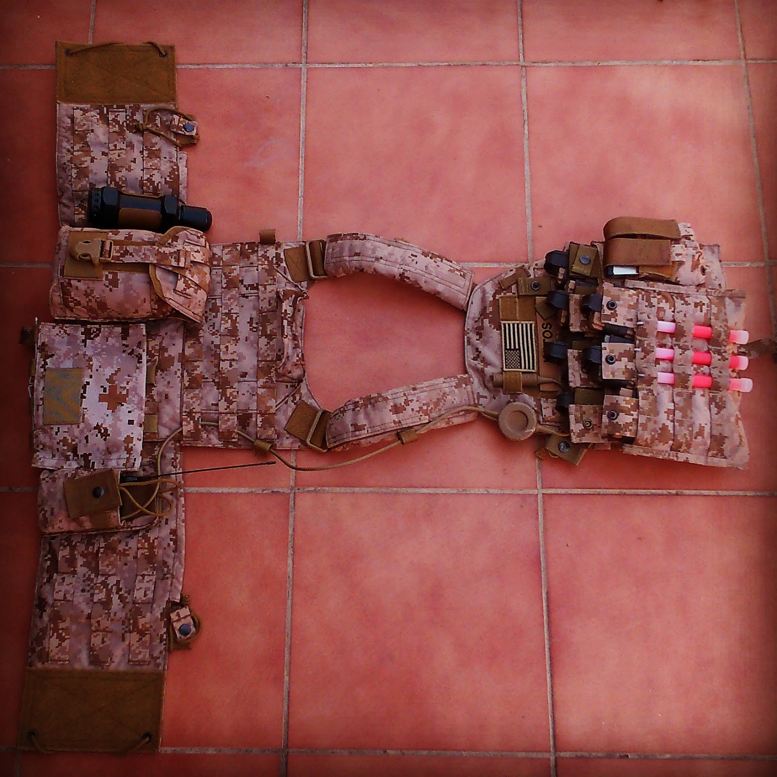 Este es el componente más caro de la equipación y lo tenemos de dos tipos, Pantac(El mío) y Flyye(el de los demás). Es un chaleco completo, con placas dummy incluidas. El mío incluye un radio pouch, utility/canteen pouch y un double mag pouch de Pantac, un pouch triple tipo kangaroo abierto MI de Flyye y un medical blowout pouch también de flyye. Los pouches de Flyye son de