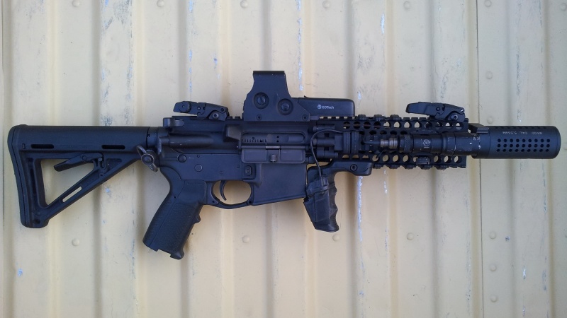 aquí. El total anda por los 360€ con silenciador AAC adaptado y el resultado es poco visto y de lo más «tacticool» que me he encontrado en este hobby. El accesorio para mira es válido para todas las versiones. Se usan con una variedad de miras, desde tipo Aimpoint M2 hasta Eotech 552. El silenciador es