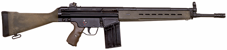 aquí. Lo tenemos de JG que posteriormente tendremos que modificar bastante para que tire decentemente. No suele gustarme porque luego lo barato sale caro, pero al ser un custom que hay que modificar externamente, prefiero un JG que un Marui. Dado que el que sale en la serie es un modelo acortado, tendríamos que perforar al estilo g3 sudafricano con 5 orificios rectangulares a cada lado(esto es opcional, pero si queremos el efecto se puede hacer con las herramientas y la habilidad adecuadas) y sustituir el cañón externo por un silenciador de unos 18cm, preferentemente liso. Al cuerpo habría que adaptarle un RIS como